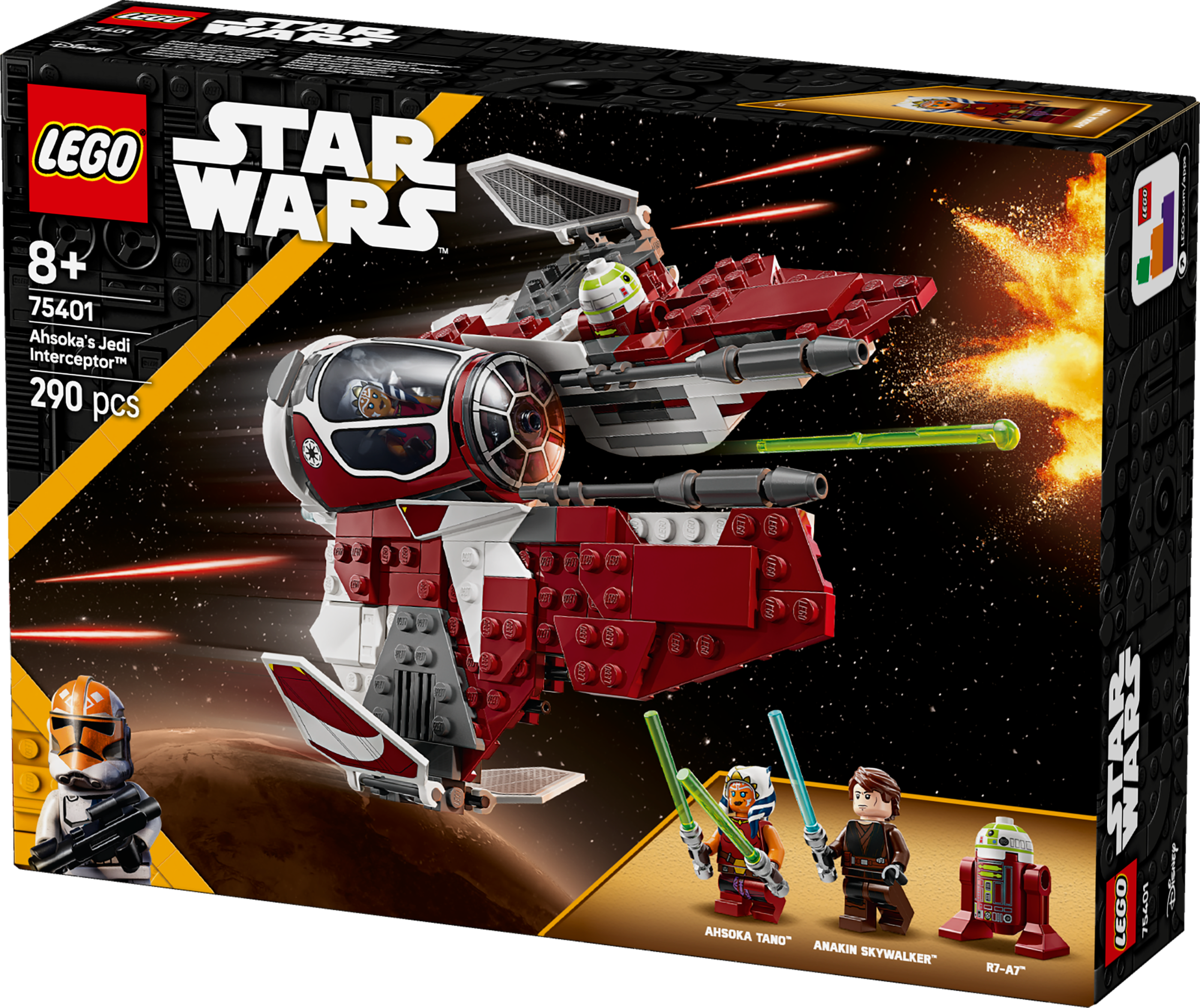 Let kids create their own exciting Star Wars: The Clone Wars™ adventures with Ahsoka’s Jedi Interceptor Starfighter Building Toy (75401). A cool LEGO® Star Wars™ gift idea for boys, girls and fans aged 8 and over, this brick-built Jedi Interceptor features an opening cockpit, adjustable wings for attack and cruise modes, and 2 spring-loaded shooters. The buildable playset includes 2 LEGO Star Wars minifigures – Ahsoka Tano and Anakin Skywalker with Lightsabers™ – plus an R7-A7 LEGO droid figure for fantasy play. Ahsoka can be placed in the Jedi Interceptor’s cockpit, and there’s room on board for R7-A7 and storage for Ahsoka’s Lightsabers™.