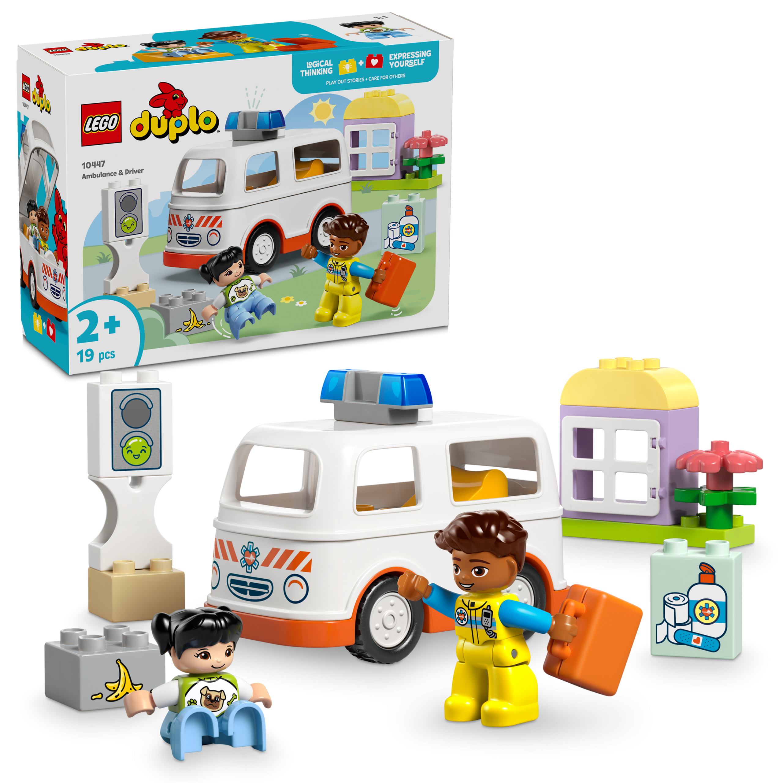 Caring toddlers pretend play exciting rescue scenes with the Ambulance & Driver (10447) toy for preschoolers. This toddler toy also includes a drivable ambulance toy and 2 LEGO® DUPLO® figures, a paramedic and girl, for creative imaginary play.