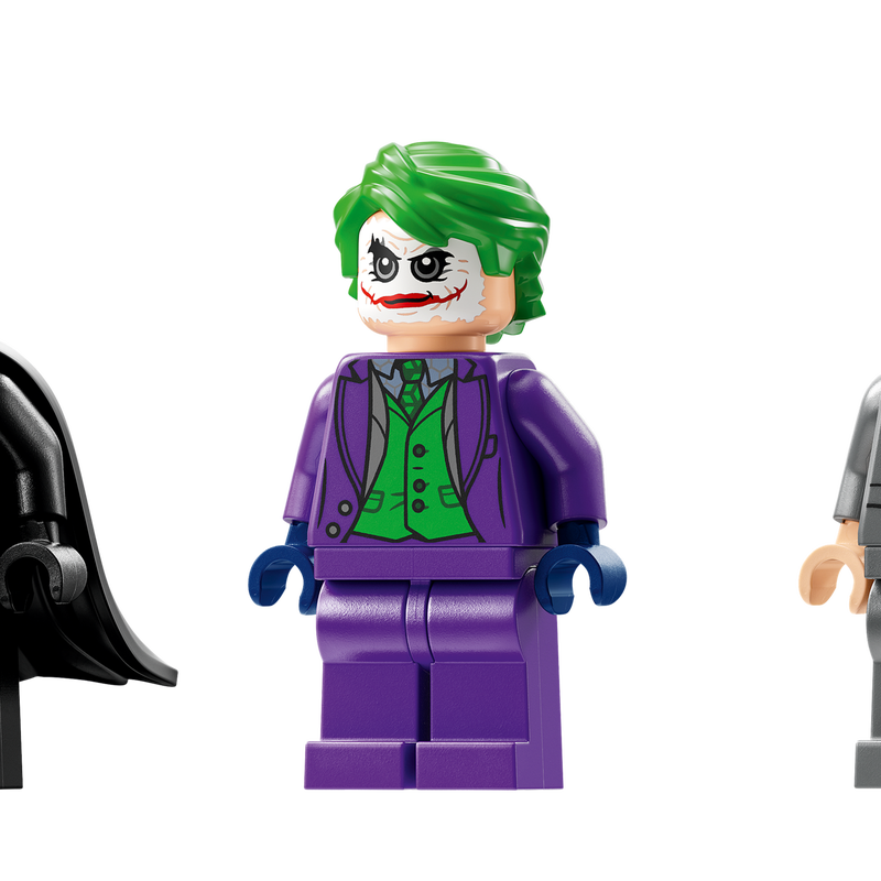 • LEGO® DC Super Heroes™ – Batman™ minifigure armed with his Batarang™, The Joker™ minifigure holding a wad of cash, and a Two-Face™ minifigure with his trademark silver coin