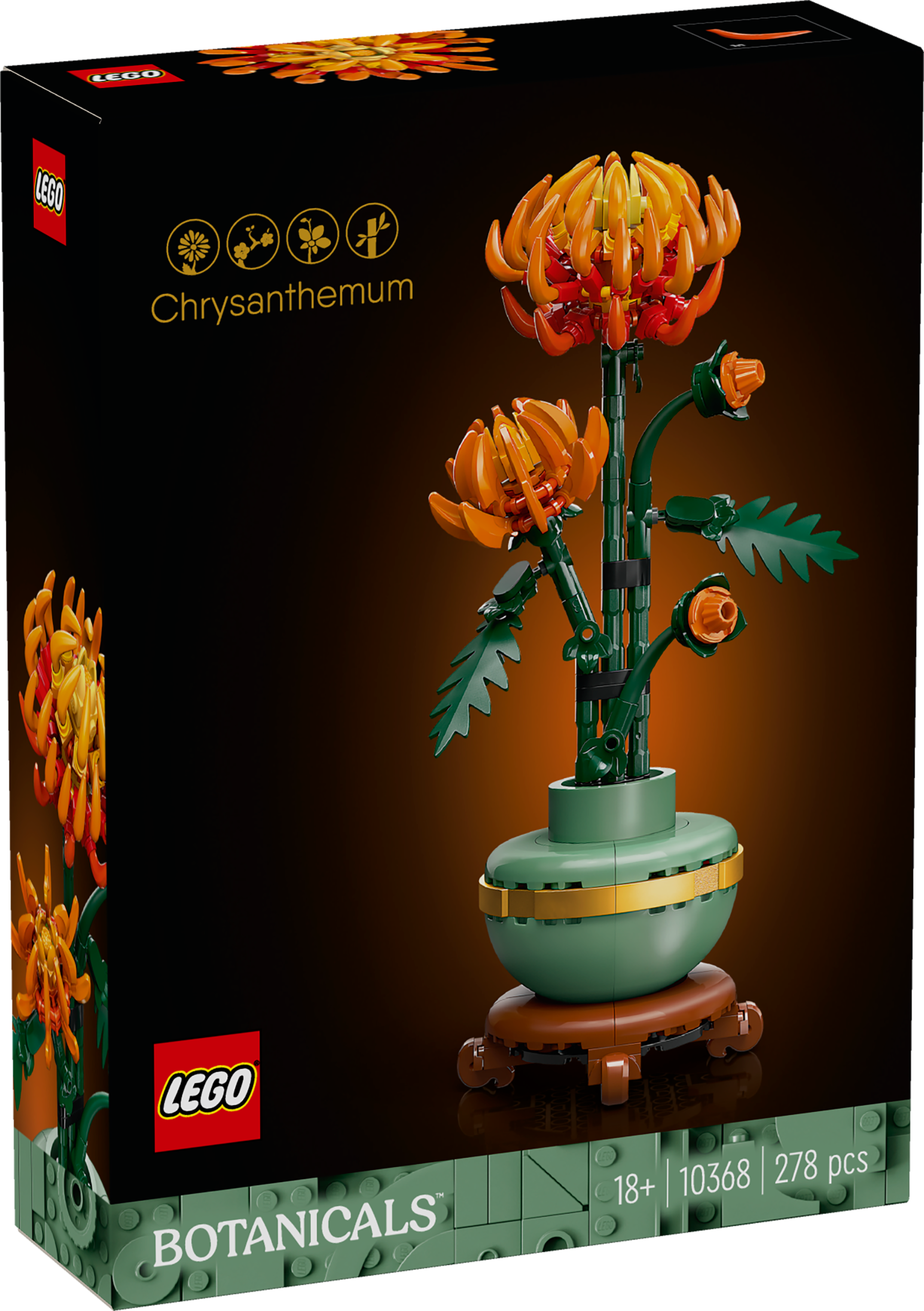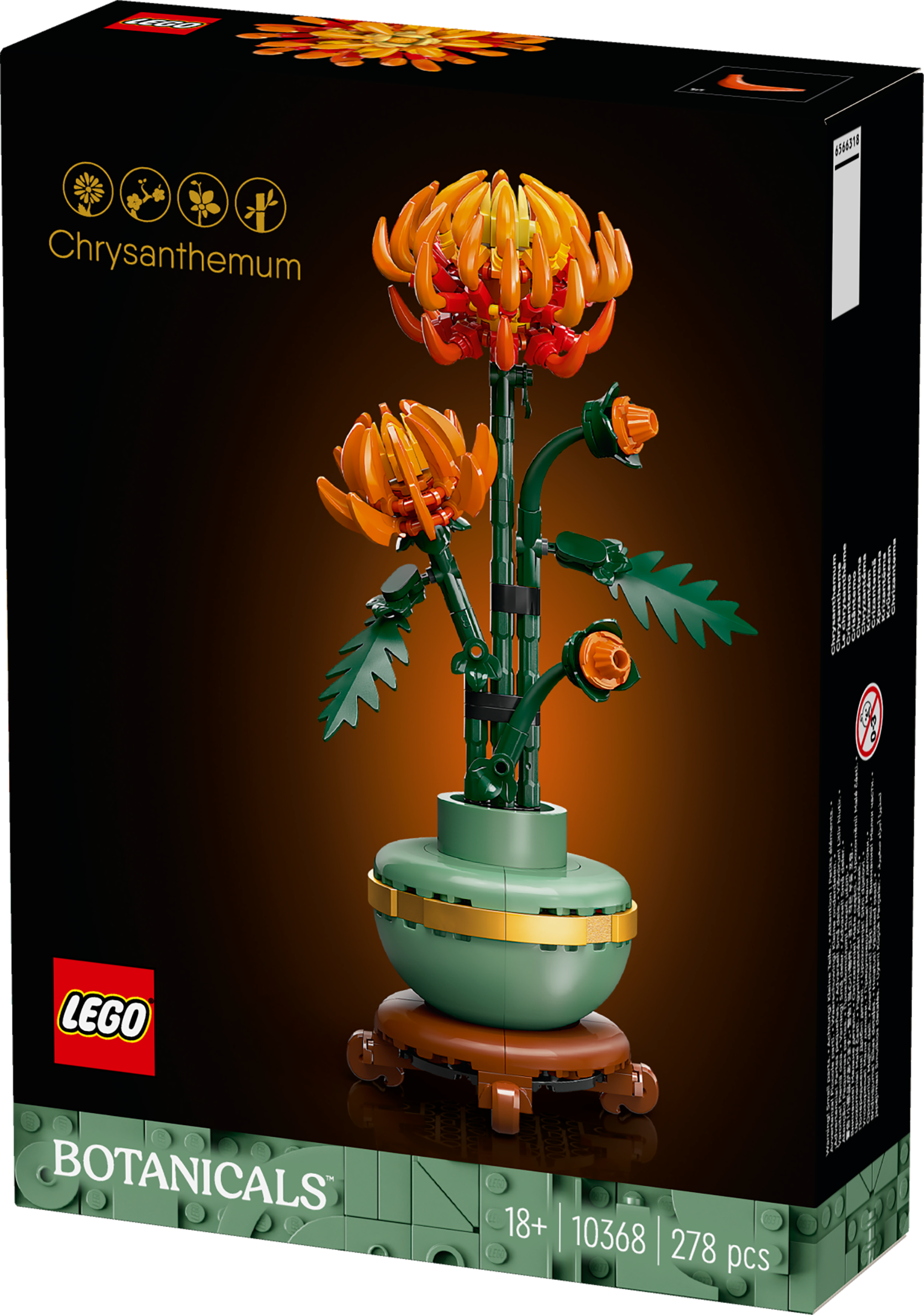 This detailed replica, with posable leaves and petals, captures the vivid orange flower in bud, blooming and in full bloom and comes with a pastel-green flowerpot decorated with a golden band and set on a wood-effect plinth. Easy to assemble, the model chrysanthemum plant makes an elegant centrepiece for any space and can be displayed alongside other sets from the LEGO Botanical Collection (sold separately).