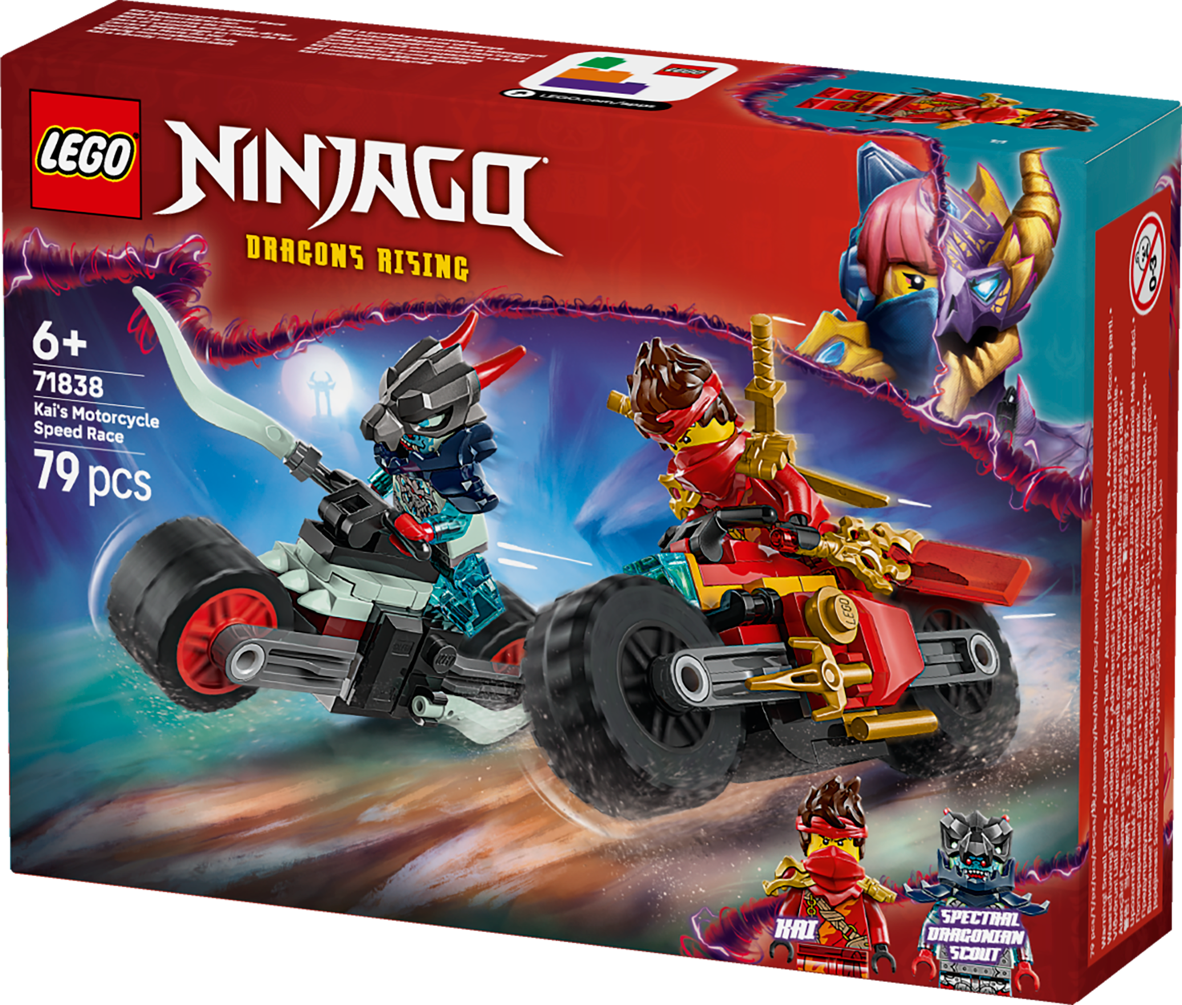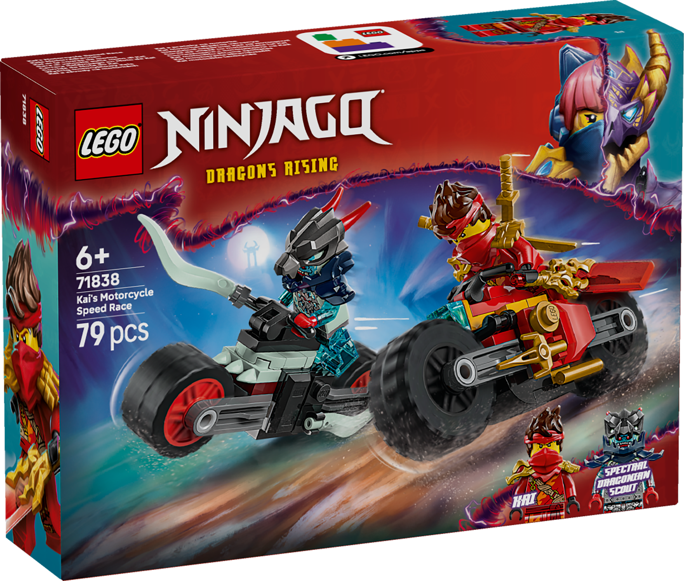 Kai’s Motorcycle Speed Race (71838) playset lets boys and girls aged 6 and over recreate fast-paced scenes from season 3 of the NINJAGO® Dragons Rising TV show. The action-packed motorcycle toy battle set features 2 ninja bike toys with moving wheels: Kai’s race bike adorned with 2 daggers, and the villainous Spectral Dragonian Scout’s demon bike.