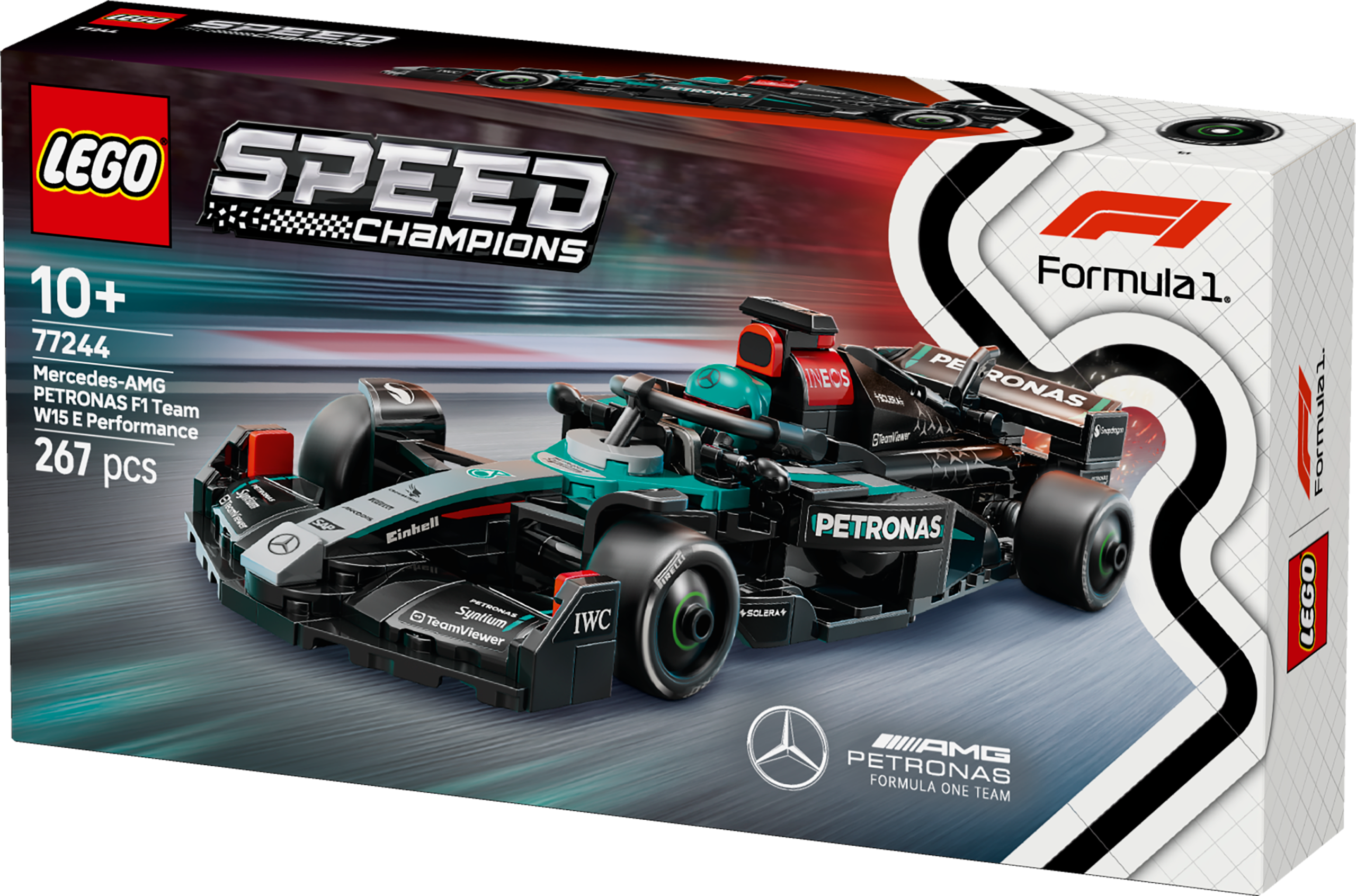 Boys and girls aged 10 plus can collect, build, display and race this awesome LEGO® Speed Champions Mercedes-AMG PETRONAS F1® Team Race Car (77244) toy vehicle. The sleek Mercedes-AMG F1 race car for kids and Mercedes-AMG PETRONAS F1 Team fans includes design details from the car that competed in the 2024 Formula 1® World Championship.