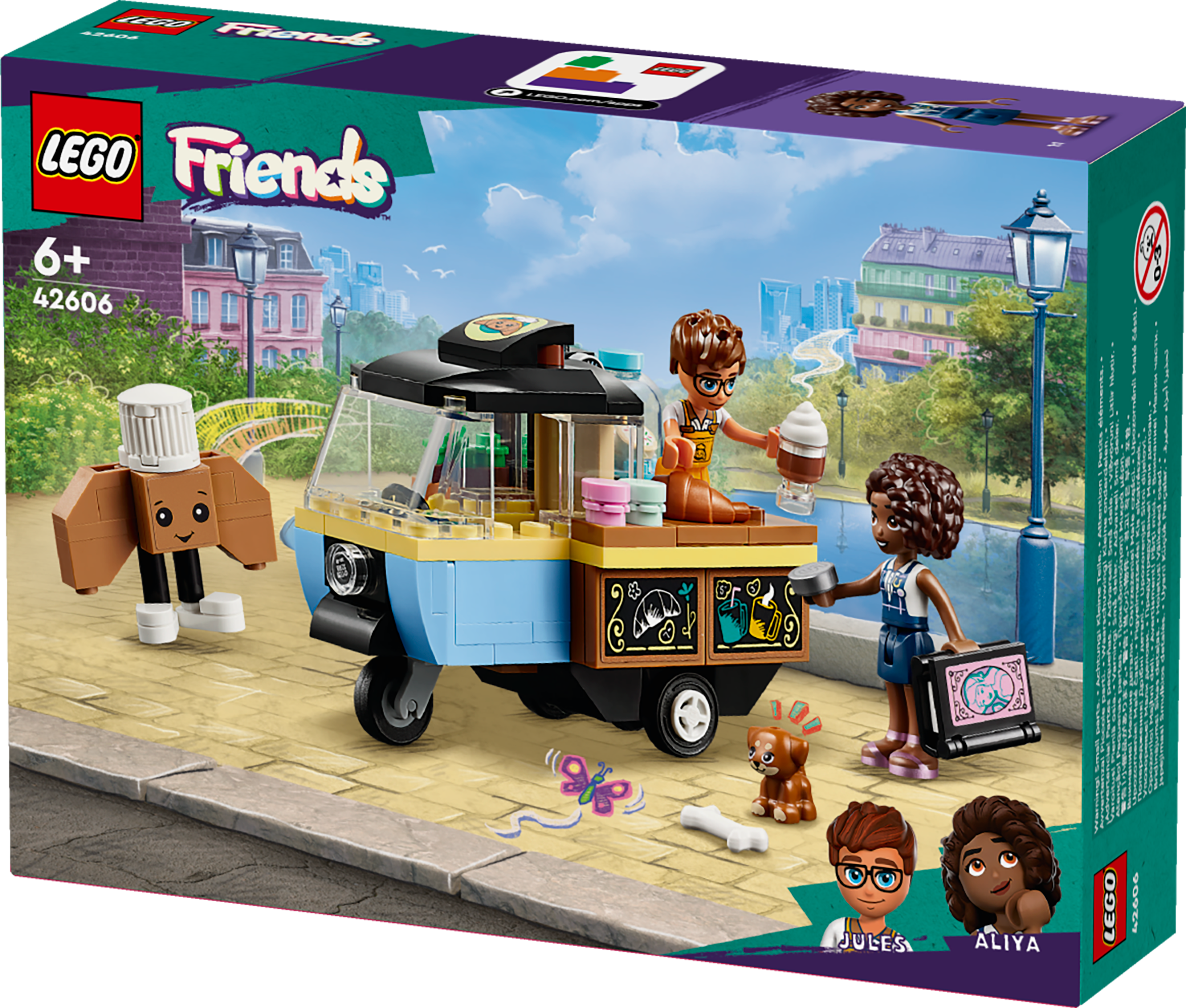 Inspire creative play with the LEGO® Friends Mobile Bakery Food Cart (42606) playset for girls, boys and kids aged 6+. Kids who love role play can act out the story as Aliya visits the toy bakery cart with her pup Aira. The set includes 2 minidolls, a dog, a cart, a bakery mascot and accessories.