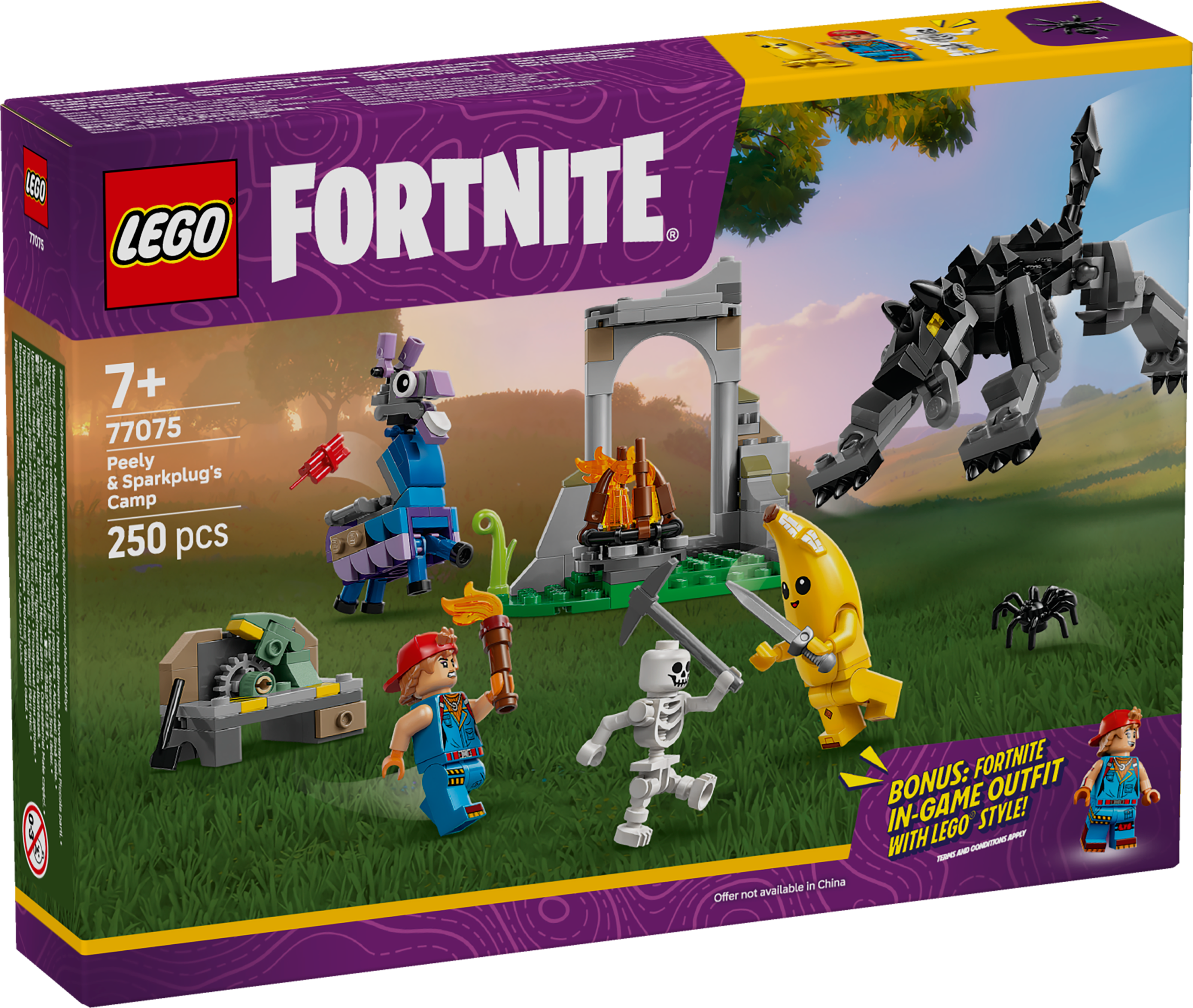 Thrill gamers with this LEGO® Fortnite® Peely & Sparkplug’s Camp (77075) building set for kids aged 7 and over. Packed with recognisable elements and iconic characters, the video game set encourages fans to create their own LEGO Fortnite adventure.
