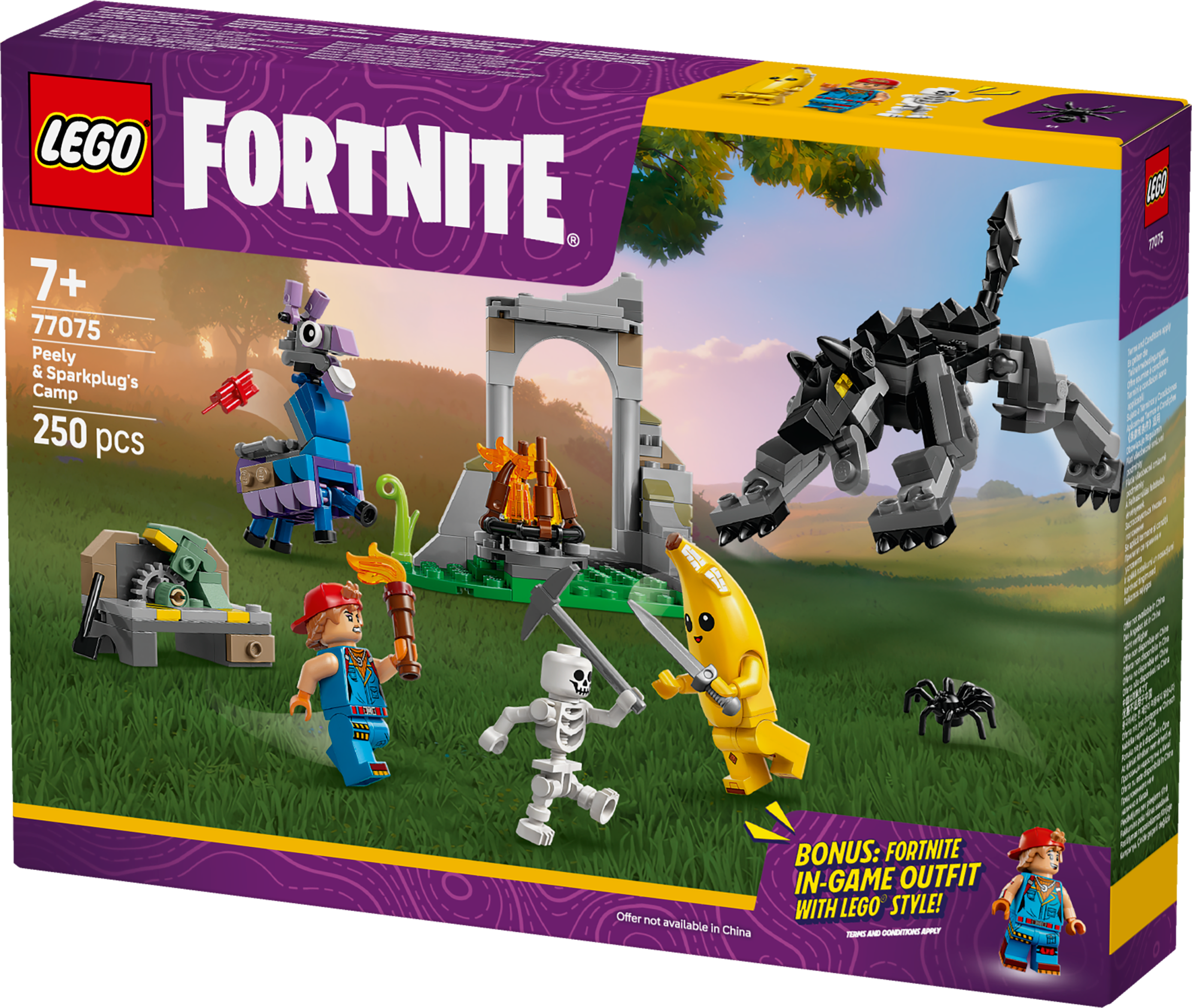 The playset replicates the first challenges players encounter in the LEGO Fortnite Odyssey video game, and boys and girls will have fun building the campfire, a workbench and ruins that can be deconstructed and reconfigured. It also features a Supply Llama figure and a wolf figure with a movable tail and legs. The action is brought to life by minifigures of Peely, Sparkplug and a skeleton, who come with weapon accessories to encourage imaginative role play.