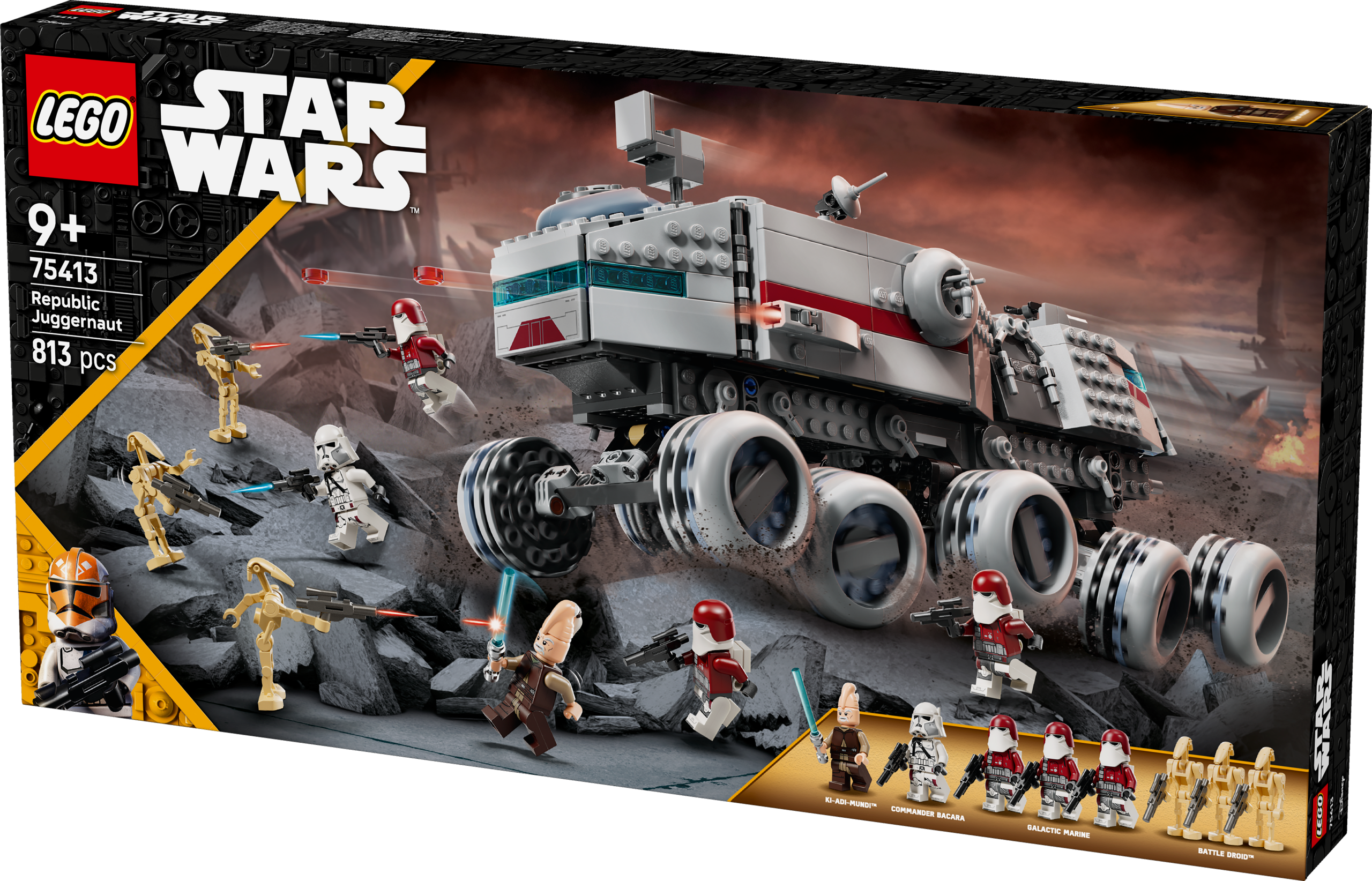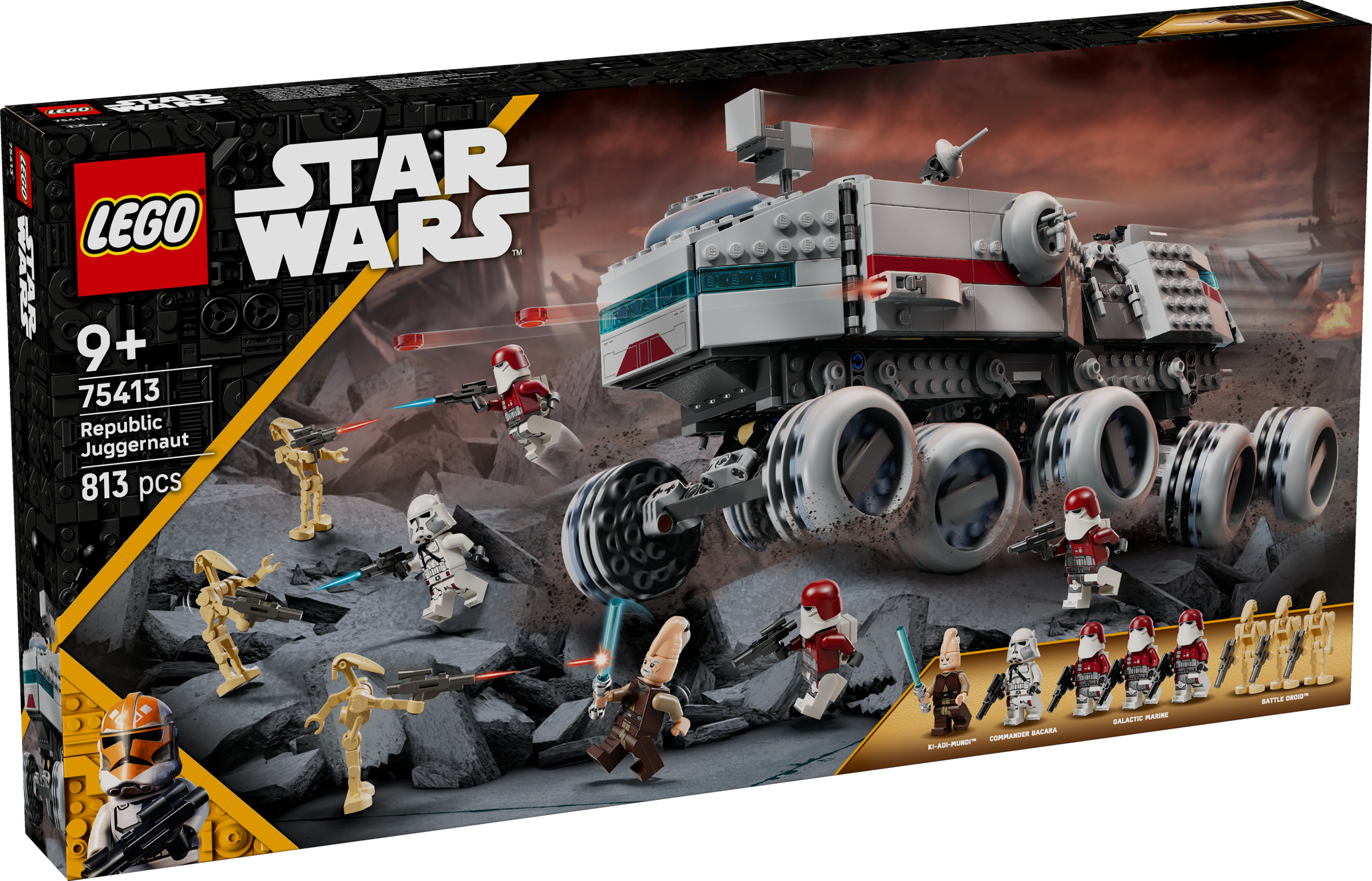 Let kids lead their own heroic Star Wars: The Clone Wars™ battle missions with the Republic Juggernaut buildable transport vehicle toy (75413). A cool LEGO® Star Wars™ gift for boys, girls and fans aged 9 and over, this impressive 10-wheeler is steered by simply tilting the model as you move it, and it has easy access to the detailed interior.