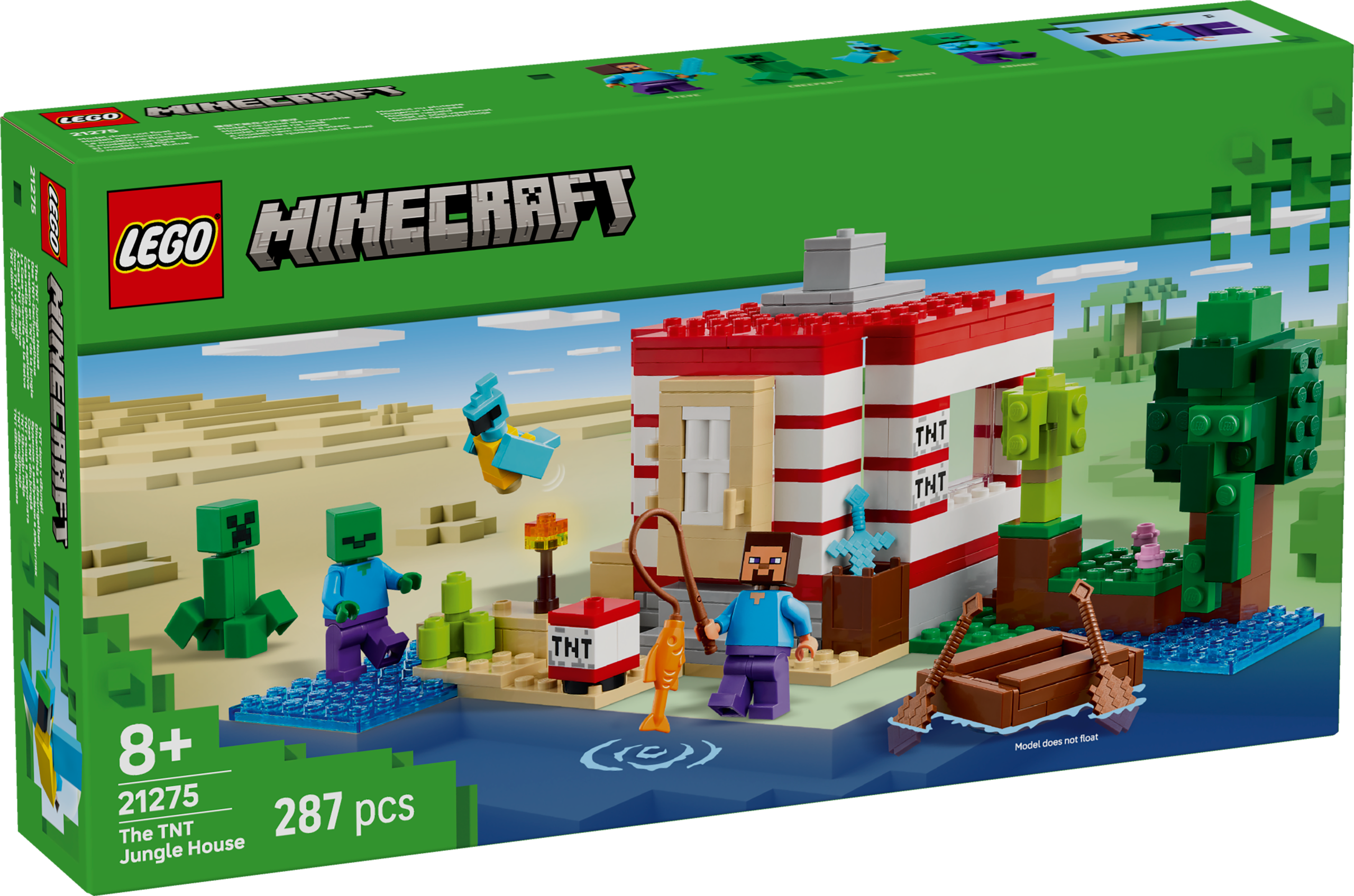The buildable house is set in the Minecraft jungle biome and looks like a large-scale version of the game’s iconic TNT element. A switch on the side lets kids trigger an exploding TNT function, which collapses the entire house. When the dust settles, kids can rebuild the house so it’s ready for their next adventure. Steve, Creeper™ and zombie minifigures inspire imaginative play and battle action. Authentic LEGO Minecraft accessories include a boat, fishing rod, fish, parrot and jungle foliage. The LEGO® Builder app gives kids the added fun of using their device to zoom in and rotate models in 3D. Contains 287 pieces.